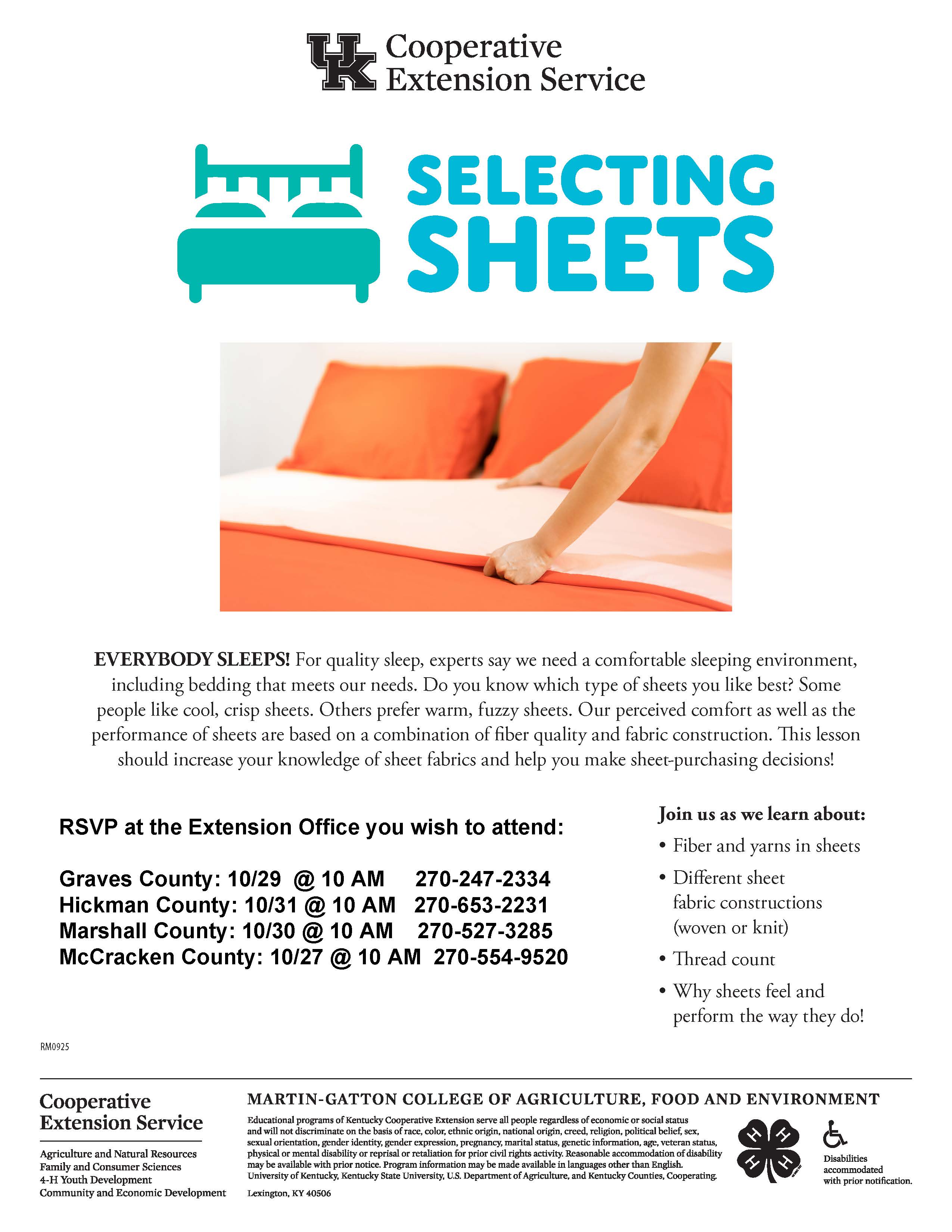 In-PersonEVERYBODY SLEEPS! For quality sleep, experts say we need a comfortable sleeping environment, including bedding that meets our needs. Do you know which type of sheets you like best? Some people like cool, crisp sheets. Others prefer warm, fuzzy sheets. Our perceived comfort as well as the performance of sheets are based on a combination of fiber quality and fabric construction. This lesson should increase your knowledge of sheet fabrics and help you make sheet-purchasing decisions! Call to (270) 554-9520 to sign up.